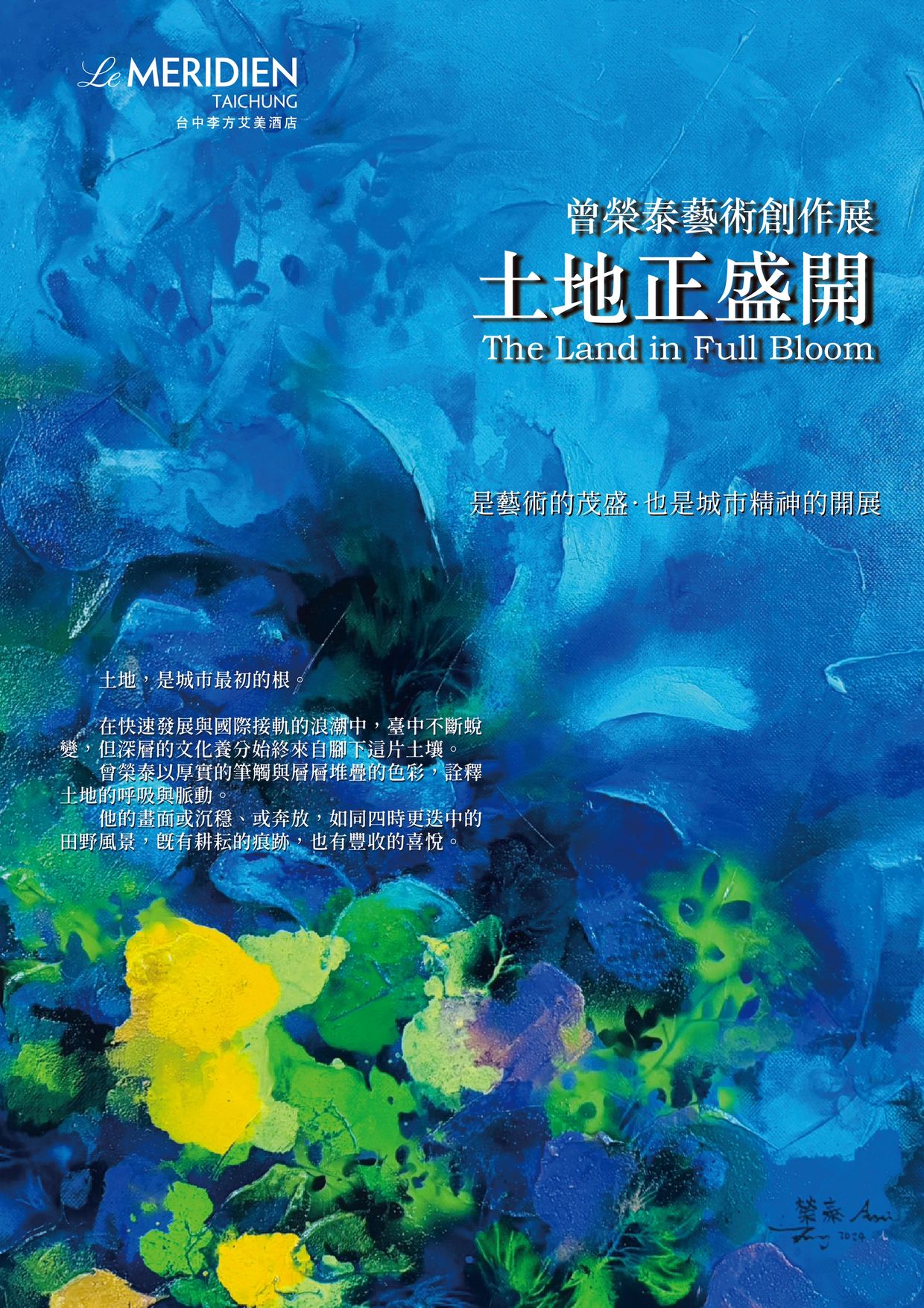 「土地正盛開」不僅是一個展覽名稱,更是一種精神象徵——象徵在地文化在國際舞台上綻放光彩。當國際五星級酒店進駐臺中,帶來世界級視野與品味,也為在地藝術創作提供更寬廣的展示平台。這場展覽正是城市與藝術彼此滋養的最佳見證。
